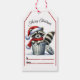 Un alegre mapache vestido con gafas y un sombrero de Papá Noel sale de un cubo de basura, añadiendo un juguetón a las etiquetas de regalo de Navidad adornadas con decoraciones festivas.