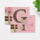 Monograma G con etiqueta chica y cinta de punto y borde de unión de guarnecido de vieiras con bordes de novedad y flor de aspecto aplicativo con botón.