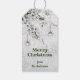 Una simple y elegante etiqueta de regalo para Navidades con una rama cubierta de nieve con adornos de estrellas de plata sobre un fondo brillante.