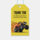 Impulsa tus favores de fiesta con estas etiquetas de regalo de cumpleaños de Monster Truck de alta energía. Con un camión enorme decorado con llamas que hace una "caballito", estas etiquetas son la forma perfecta de unir tu tema. El fondo amarillo brillante y el texto negro en negrita aseguran que tu mensaje de agradecimiento se destaque en cualquier bolsa de dulces o regalo.