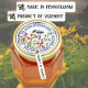 Abeja estilizada en etiqueta blanca con su estado o nombre de país escrito en un texto decorativo en negrita. El pegatina es evidente y la tapa no se puede abrir sin destruir la etiqueta.