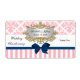 Etiqueta de Fiesta de la cinta azul de la correa blanca rosada Damask de la marina Damask Damask diseño con un patrón de damasco rosa y blanco emparejado con un patrón rayado rosa y blanco. Está adornado con un lazo de arco de satén azul marino.