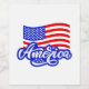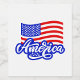Ilustracion de la palabra "América" en una letra de guión estilizada, ¡con una bandera norteamericana ondeando encima! La palabra "América" se representa en un color azul profundo con un contorno azul más claro, lo que le da un efecto tridimensional. Debajo de la palabra, hay una hilera de pequeñas estrellas blancas, haciendo eco de las estrellas en la bandera. La bandera americana está decorada con rayas rojas y blancas y un cantón azul lleno de estrellas blancas. El estilo general es limpio y gráfico, con una temática patriótica.