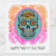 Una atrevida carta de vinos de la fiesta de Halloween con cráneo de azúcar pintado en naranja, turquesa y rosa picante, en un fondo de pizarra con un original tipo de letra. En la parte trasera de la tarjeta hay un color rosa picante. ¡Seguro que captan su atención!
