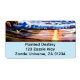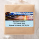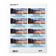 Pintura de una playa al amanecer con pequeñas olas y gaviotas volando en el colorido cielo rosa y naranja.