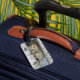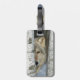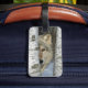 Etiqueta atractiva del equipaje que ofrece una foto de un lobo gris entre algunos árboles de abedul