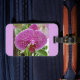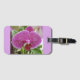 Etiqueta de equipaje de orquídea morada brillante con ranura de tarjeta de visita en la parte trasera.