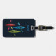 Tres kajaks estilizados brillantes en un fondo de los azules marinos - una gran etiqueta del equipaje del deporte acuático para el entusiasta del kajak o los clubs kayaking. Completamente adaptable.
