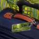 La etiqueta del equipaje con el diseño delantero del camino viajó menos a través de una madera del bluebell.