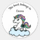 Colorida etiqueta de libro de nombres personalizados de unicornio para niños.