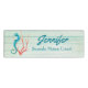 La etiqueta temática del nombre del empleado de la playa de la playa hecha en verde de la aguamarina lavó hacia fuera la mirada de las pizarras de madera, con los gráficos de un seahorse y de un coral coloridos, en el lado izquierdo. Personalice el texto azul de la aguamarina para adaptarse a sus necesidades del negocio.