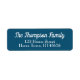 Etiqueta de nombre y dirección de devolución azul y blanca con el nombre de su familia en una fuente de escritura encima de los detalles de su dirección.