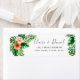 Diseño de etiquetas de direcciones de retorno boda tropical con hojas tropicales de acuarela y flores en un fondo blanco.