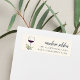 Las etiquetas con los nombres en blanco y negro cremoso incluyen el nombre y la dirección de retorno con letras de color gris y azul ahumado junto a un ilustracion acuarela de un vaso de vino tinto adornado con ramas de olivo.
