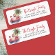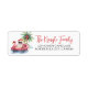 Etiqueta de dirección de devolución de Papá Noel Tropical. Esta etiqueta festiva de dirección de devolución presenta a un relajado Papá Noel descansando en un flotador de flamenco rosa, rodeado de detalles de vacaciones tropicales como una palmera decorada con adornos, olas suaves del océano y una pequeña isla en el fondo. El encantador arte de acuarela aparece a la izquierda, mientras que su nombre y dirección están a la derecha en una mezcla de fuentes de escritura y serif, con el nombre mostrado en rojo para un toque estacional audaz.