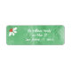 Personalice fácilmente estas etiquetas de dirección de retorno de vacaciones con sólo unos cuantos clics. Estos pegatinas de dirección están decorados con texto de escritura en blanco sobre un fondo verde.