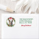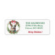 En esta etiqueta de dirección de regreso de vacaciones, un perro de ganado australiano está enmarcado dentro de una corona de Navidades verdes con un arco rojo en la parte superior. El texto de su personalizado está en verde a la derecha, con un campo de texto para un saludo en rojo debajo.