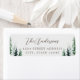 Etiquetas de regreso de vacaciones diseñadas por personalizados que presentan un diseño rústico de pinos acuarelas con caligrafía nombre familiar y dirección sobre fondo de color gris claro.