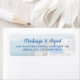 Etiqueta de dirección de retorno de línea de horizonte de la línea de costa de Santorini Grecia con la famosa iglesia de la cúpula azul y los acantilados marinos de Agean como fondo descolorido con fuentes de escritura elegantes y modernas, perfecta para invitaciones a bodas de destino griegas y Guardar las fechas.