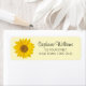 Un girasol amarillo brillante con una combinación de nombre escrito en guión y dirección en letra simple en mayúsculas sobre fondo amarillo claro.