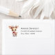 Etiquetas de direcciones con un ilustracion de un adorable ciervo bebé. Ojos grandes orejas grandes con una cabeza grande y pequeñas cuerdas marrones. Con un gran arco rojo.