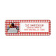 Esta etiqueta de dirección de cangrejos de río presenta un cangrejo de río lindo sentado en una olla con maíz y cebolla roja. Al fondo hay un mantel de picnic perfecto para combinar con tu fiesta de mariscos.