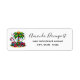 Etiquetas de direcciones con una imagen de vacaciones de temporada. Una palmera tropical adornada con luces festivas y una estrella en la parte superior. Un enorme bastón de caramelo rojo y blanco saliendo de la arena. Regalos de Navidad debajo del árbol. Genial y divertido.