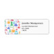 Etiquetas de direcciones con un patrón divertido y colorido. Los investigadores científicos vivirán con vasos y frascos de diferentes formas y tamaños en colores alegres y brillantes.
