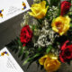 El diseño presenta elegantes girasoles, rosas y flores silvestres con una paleta de colores dorados amarillo, burdeos y azul. Puede cambiar el color de fondo en la parte delantera y de vuelta al color de su elección o dejar ambos en blanco.