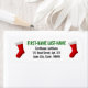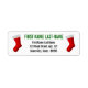 Este sencillo diseño de etiquetas de dirección presenta dos medias de Navidad rojo en los lados, con un nombre de personalizable y una dirección entre ellos.