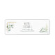 Delicados arreglos de vegetación inspirados en la naturaleza, incluyendo eucaliptos de goma azul con salpicaduras de dorado y de hojas de oro junto con diseños únicos, hacen de este hotel un emocionante boda para cualquier época del año. La etiqueta de la dirección de retorno del boda que se muestra aquí incluye frondosos bordes de las esquinas de follaje, marcos de las esquinas doradas y los nombres y direcciones de la novia y el novio. Vea el vínculo de colección en esta página para ver todos los elementos coincidentes de este hermoso diseño o busque ID817 para ver otras piezas y opciones de color para este conjunto.