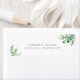Una elegante etiqueta de dirección de retorno de boda con eucalipto acuarela y hojas botánicas con un sencillo y clásico tipo de letra sans serif.