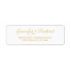 Crea tus propias etiquetas de dirección de devolución personalizadas, simples, elegantes y modernas con letra dorada amarilla. Simplemente ingresa los nombres de la novia y el novio / esposa y esposo, y la dirección. Etiquetas de dirección de devolución elegantes para usar en bodas, aniversarios de matrimonio, cumpleaños, despedida de soltera, baby shower, fiestas, o cualquier otra ocasión especial relacionada con envíos por correo.