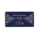 Elegante etiqueta de dirección de regreso de boda azul marino moderna y elegante con corazón de cuerda plateada y encaje floral dorado.
