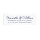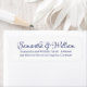 Elegante escritura azul y blanco personalizado caligrafía nombres boda de moda devolver etiquetas de dirección. Las líneas de dirección tienen suficiente espacio para los apellidos largos y la dirección