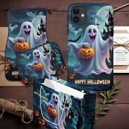 Encantador diseño de Halloween transmite. Un pequeño y amigable fantasma a través de la noche oscura y mística. El fantasma tiene un blanco suave y luminoso y una sonrisa traviesa que crea un ambiente acogedor. A su alrededor, estrellas pequeñas brillan en el cielo y la luna brilla en un tono suave. Las calabazas proyectan sombras suaves en el suelo, lo que le da al diseño un ambiente cálido y otoñal.