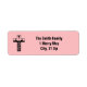 Una bella escena nativa dentro de la cruz cristiana. Con Joseph y María, y el bebé Jesús en un pesebre con la estrella de Belén y ángel arriba. Fondo rosa de moda con silueta y tipografía negra. navidades. Natividad.