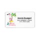 Etiquetas de direcciones con un lindo ilustracion de un flamingo rosado en un sombrero de santa roja. Junto a una palmera verde sobre un montón de arena amarilla. Junto al texto Feliz Navidad se encuentra un diseño de árbol de Navidad con poco movimiento. Escrito en el color rosa en un lujoso tipo de letra manuscrita.