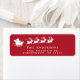 Etiqueta de la dirección de retorno roja divertida y festiva para la temporada de vacaciones de los Navidades con una silueta blanca de renos que vuelan en trineo de Santa por el aire, y tu nombre y dirección familiar en una simple tipografía blanca moderna.