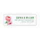 Esta etiqueta de dirección de devolución presenta un diseño limpio y minimalista con dos grandes peonías rosadas a la izquierda y tipografía serif elegante a la derecha. Los suaves pétalos rosados contrastan maravillosamente con las hojas verdes oscuras, creando un aspecto clásico y refinado. La distribución es espaciosa, lo que permite que cada elemento se destaque claramente, perfecto para ocasiones formales. La estética general transmite gracia y belleza discreta, lo que la hace ideal para bodas o eventos sofisticados.
