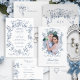 This classic and romantic design is a modern adaptation of an historic French etched ornament of dusty blue intertwined roses, flowers and foliage in a heart shape ca 1770 by Rococo designer Pierre Ranson. Included are text fields for your monogram, names and address.