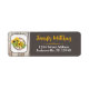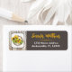 Estas etiquetas de dirección de devolución rústicas se coordinan con la colección de invitaciones para el baby shower de la novia que se muestra a continuación y presentan una rueda de carro pintada con acuarelas marrones con girasoles y vegetación superpuesta en la parte superior izquierda. Debajo de la rueda del carro, hay una superposición en forma de boleto blanca y marrón que tiene un fondo con patrón de grano de madera detrás. El lado derecho de esta etiqueta de dirección está coloreado en un color grisáceo-marrón con el nombre y los detalles de la dirección de devolución en amarillo dorado y blanco con un divisor amarillo decorativo entre ellos. Utilice estas etiquetas de aspecto rústico para los sobres de su evento de baby shower o boda de estilo campestre, western, granja o granero.