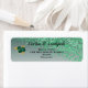 Una etiqueta elegante con glitter verde, hojas doradas y rosas verdes.