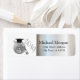 Elegante etiqueta de dirección de regreso de graduación plateada con gorra de graduación, bola de discoteca y botella de vino.