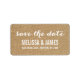 Boda aséptica ruidosa beige Guardar la etiqueta de dirección de fecha. Diseño de Elke Clarke© para MonogramGallery impreso por Zazzle. Envíe sus tarjetas de fecha guardadas a sus amigos y familiares usando esta etiqueta simple y hermosa con las palabras "guardar la fecha" escritas en un sobrepuesto de texto de escritura tipográfica con escritura a mano blanca. Efecto fotográfico impreso de fondo de burlap beige. Hay otros colores disponibles.