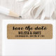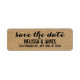 Boda de guión rústica beige Guardar la etiqueta de dirección de devolución de fecha. Diseño de Elke Clarke© para MonogramGallery impreso por Zazzle. Envíe sus tarjetas de fecha guardadas a sus amigos y familiares usando esta etiqueta simple y bonita con las palabras "guardar la fecha" escritas en un texto de escritura tipográfica de escritura a mano negra. Efecto fotográfico impreso de fondo de burlap beige. Hay otros colores disponibles.