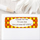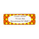Estas etiquetas de dirección de retorno tienen un diseño de los años 70 de diamantes de color amarillo sólido dentro de los contornos de diamante marrón en un campo de naranja.