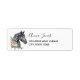 Etiquetas de dirección con un hermoso ilustracion de cabeza de caballo negro con un lujoso adorno floral al lado de su cuello. Elegante y elegante pintura animal.