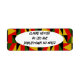 Estas etiquetas de dirección de retorno tienen un diseño de historia negra de triángulos y rectángulos en oro, rojo, verde y negro haciendo un patrón.