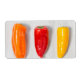 Pimientos de diferente color colocados en una tabla de corte gris Imagen © Angelika Stern